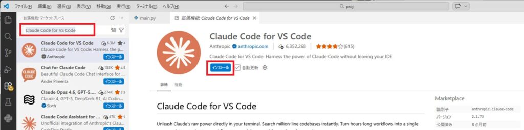 Visual Studio Codeの拡張機能で、検索窓に「Claude Code for VS Code」を入力し、Claude Code for VS Codeをインストールします。