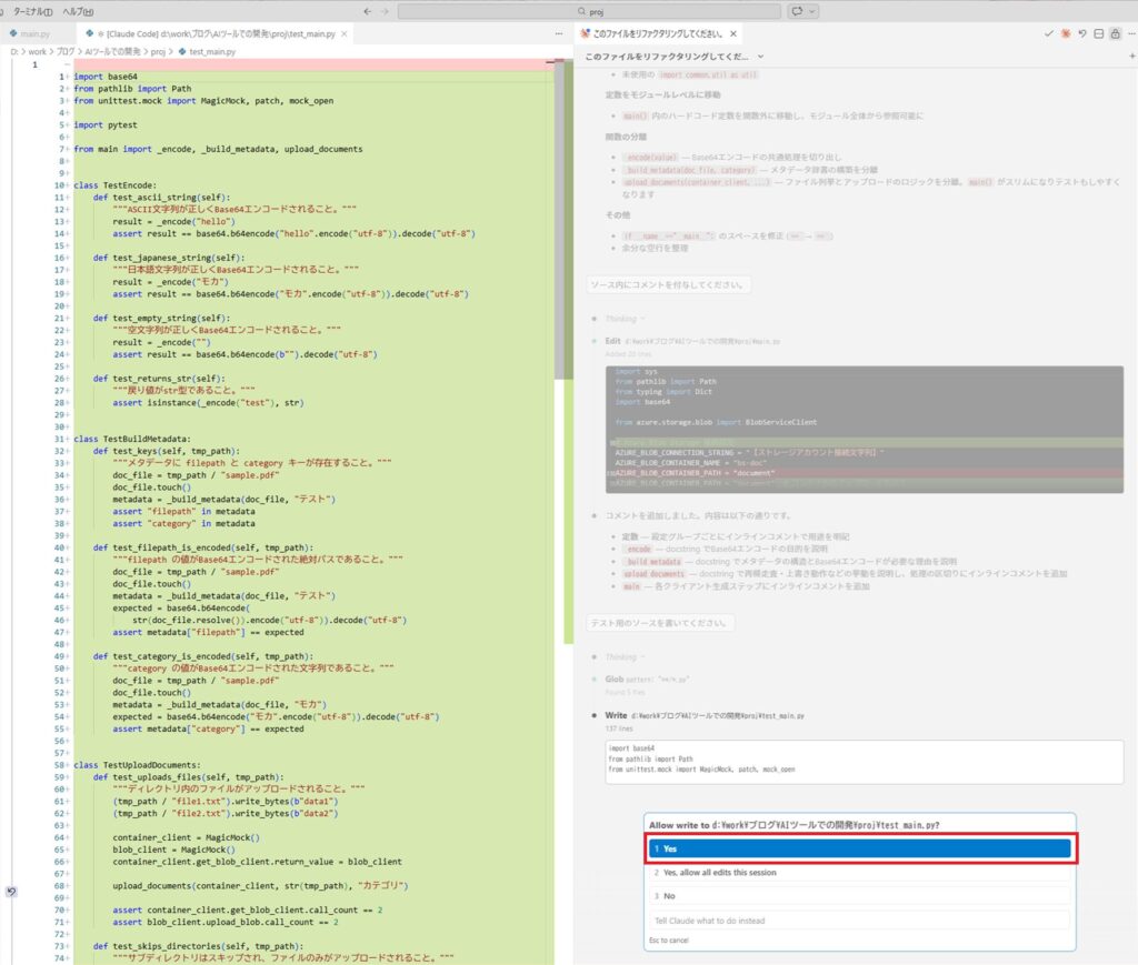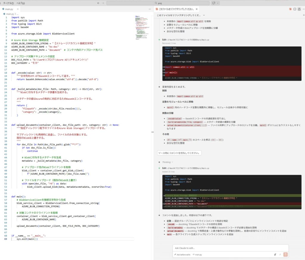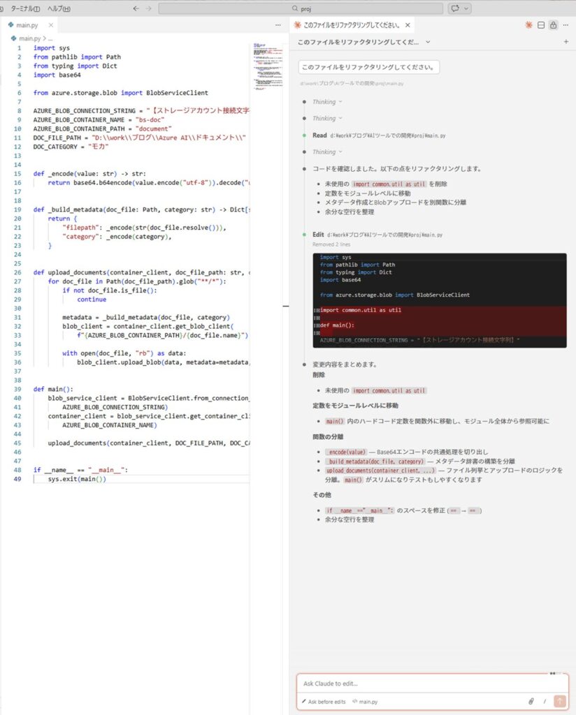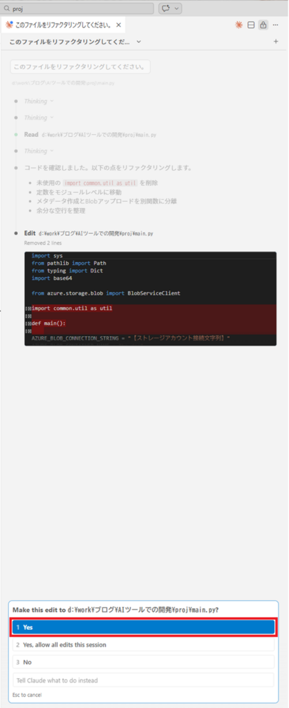 するとmain.pyがリファクタリングされ、変更内容がClaude Codeのビューに表示されます。