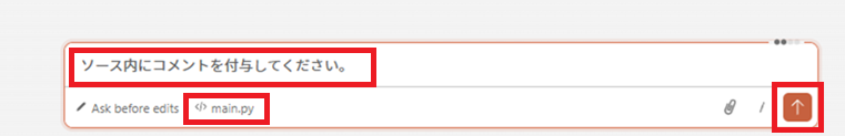 プロンプトに「ソース内にコメントを付与してください。」と入力し、[↑]ボタンをクリックします。