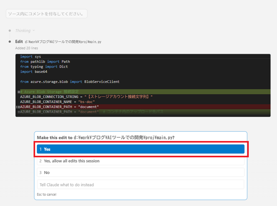 main.pyに書き込みを行ってよいか確認されるので、[Yes]を選択します。