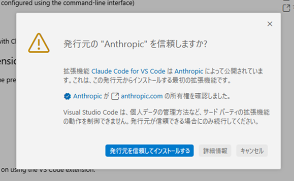 以下のダイアログが表示されるので、問題がなければ[発行元を信頼してインストール]をクリックします。