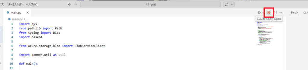インストールが完了すると、Visual Studio Codeの右上にClaude Codeのボタンが表示されます。
