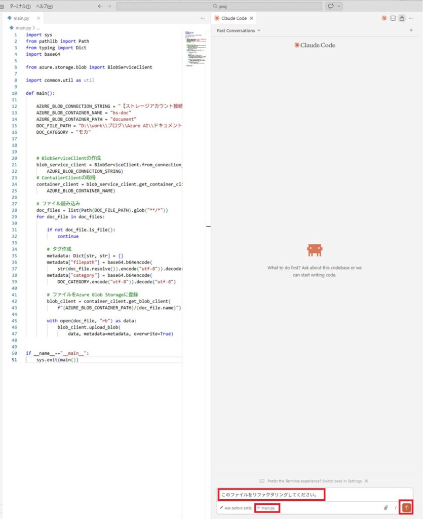 今回はmain.pyをリファクタリングするため、プロンプトに「このファイルをリファクタリングしてください。」と入力し、[↑]ボタンをクリックします。