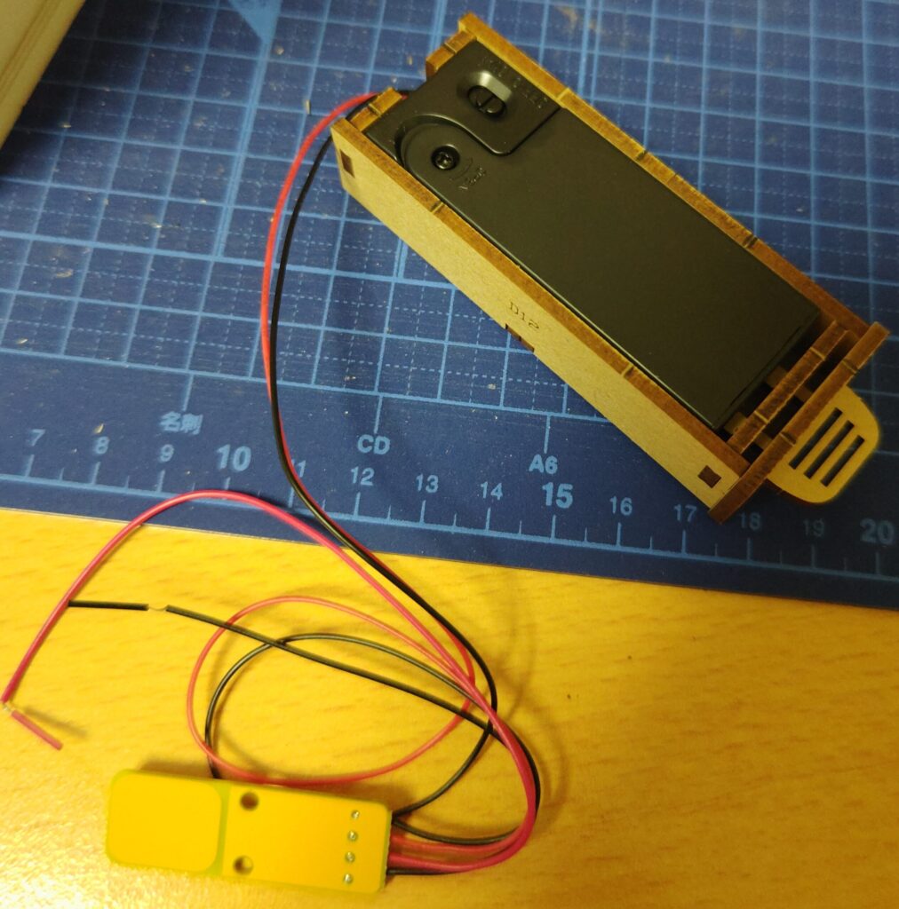 この電池ボックスは、木製パーツで作成したケースの中に収める構造になっています。