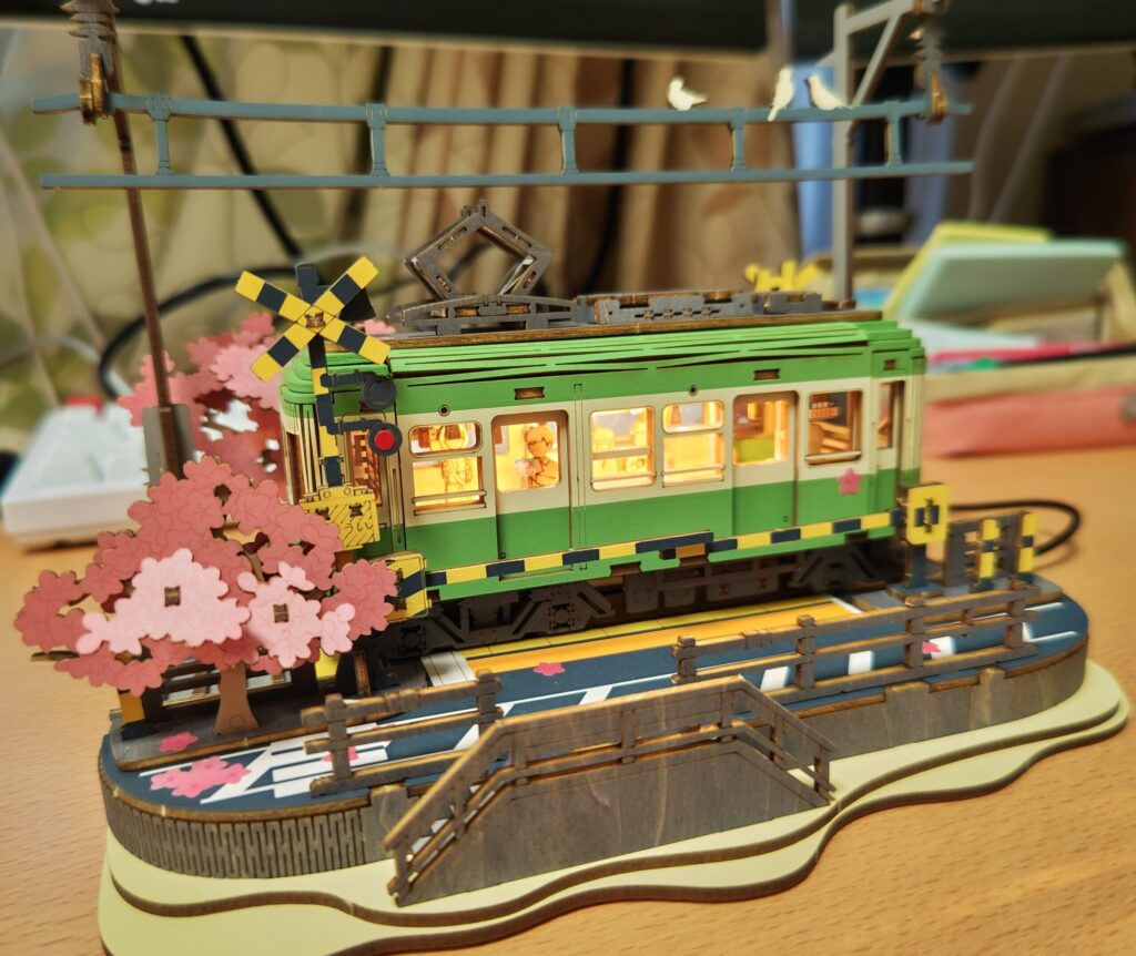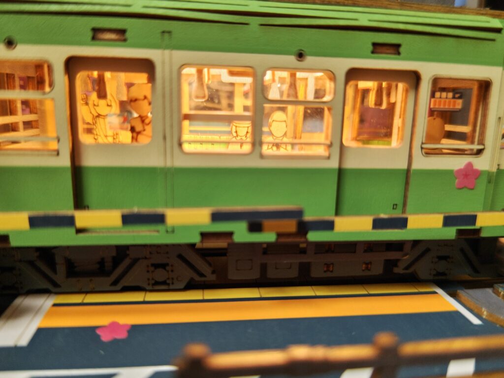 色付けもあらかじめ施されており、桜のシールや車内の窓部分にはビニール(もしくはプラスチック)のパーツを取り付けられるようになっています。 - 車内に電気が付けられる